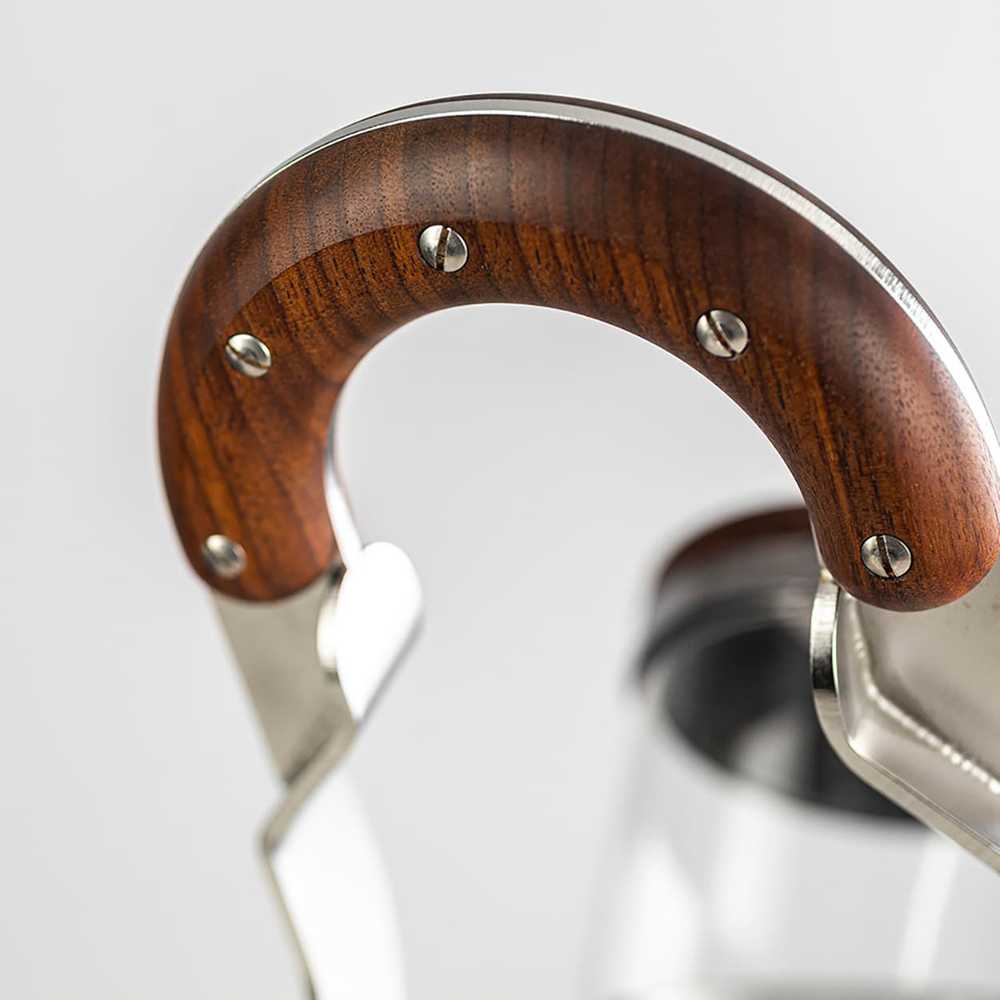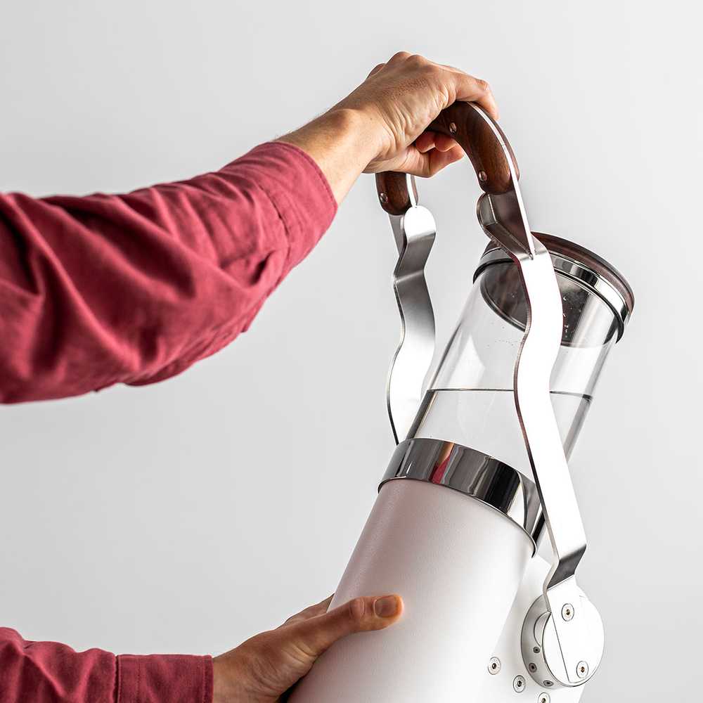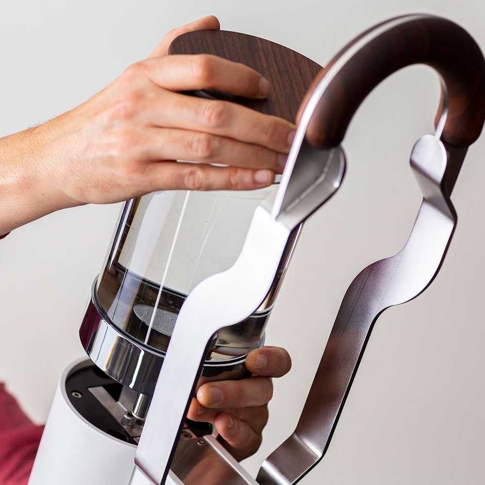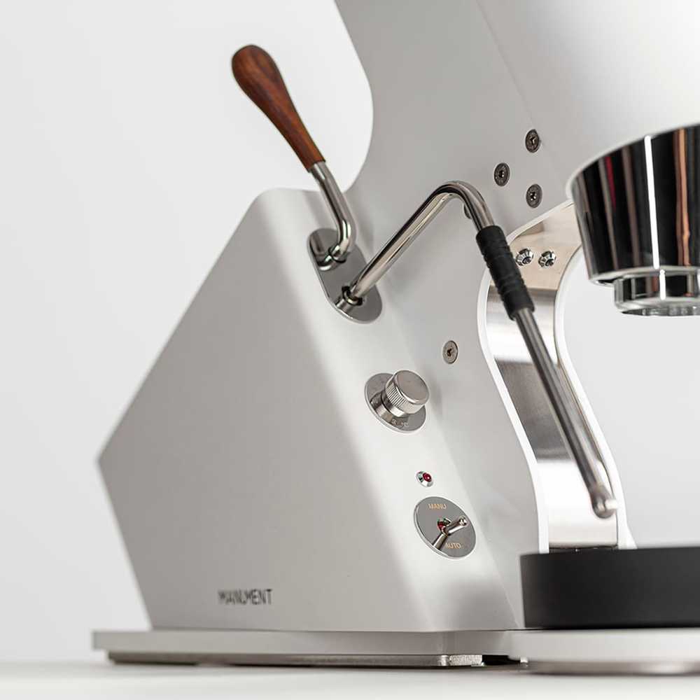 Die MANUMENT Leva-Maschine besitzt einen Hebel, der länger ausfällt, als die Hebel traditioneller Handhebelmaschinen. Das hat einen ganz praktikablen Grund: Denn die Verlängerung des Hebels der MANUMENT Leva-Maschine reduziert die Kraft, die aufgewendet werden muss, um an ihm zu ziehen. Der zylindrisch geformte Körper der Maschine ist also deshalb angewinkelt, um den Hebel einfacher zu bedienen: angefangen von der verbesserten Möglichkeit, den Hebel zu greifen und zu bedienen, bis zur Verringerung des Verletzungsrisikos beim Zurückfahren des Hebels.